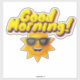 This cheerful sticker features the phrase "Good Morning!" in bright, puffy yellow lettering that immediately catches the eye. The letters are playful and slightly rounded, adding to the overall friendly vibe. Beneath the text is a smiling 3D sun, complete with cool sunglasses. The sun has a happy, welcoming expression, radiating positive energy. This delightful design is perfect for brightening up anyone's morning and spreading good vibes. Great for all ages!