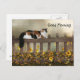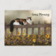 Long haired calico kitty cat sits on a wooden fence above the black eyed susans and wishes a good morning with text that is easily changed or removed cat lovers postcard