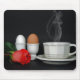 Steaming coffee and eggs with rose.