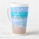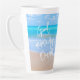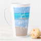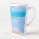 Tall latte mug with blue ocean scene. “Good morning ocean” is written at an angle on one side. Aqua blue tropical water laps at the sandy shore. A wonderful way to drink a latte and begin the day. Change the wording as you wish.
