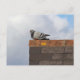 A photo of a pigeon perched on the apex of a roof on a sunny winter day.