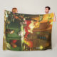 A charming vintage fleece blanket featuring Santa Claus reading lists of wishes surrounded by his diligent elves.