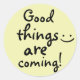 This is a cute inspirational quote round sticker that says 'Good things are coming!' printed in cute cursive letters next to a smiling face! Perfect to stick everywhere and remind you of all the good things coming your way!