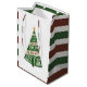 This funny holiday gift bag features a hand lettered illustration of a Christmas tree that says "good tidings and cheer and to hell with this year" on the front and back. The sides of the bag have a coordinating stripe pattern.