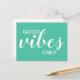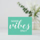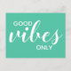 Send a little positivity with this modern “Good Vibes Only” affirmation postcard. The soft green background and clean white script create a fresh, uplifting look perfect for encouragement, everyday notes, or inspirational mail. Customise the colours or text in Zazzle’s design tool to make it uniquely yours.