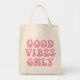 NewparkLane - Cute Tote Bag, with 'Good Vibes Only' VSCO girls quote in a retro, 60's hippie style typography in a fun, sassy pink leopard print.