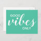 Good Vibes Only positive affirmation quote typography design features a simple modern design on a Biscay Green background with trendy calligraphy and script in white. Affirmation mindfully encourages motivation and inspiration in tough times and serves as a reminder to shift to a positive mindset. Background and type colours easily changed in the design tool area. Other colours available. Design available on other products.