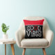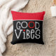 A pillow with a positive message with large quirky typography Good Vibes In white typography with a touch of red on a black background. A block of red bordered with black runs above the text and the red colour is also on the back. The background colours can be changed to different colours if you wish.