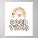 Happy and fun design featuring the text “Good Vibes” in beautiful boho lettering with a colourful rainbow.