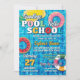 Pool themed back to school party with goodbye pool hello school in a fun typography design against an illustration of a pool with pool floats and inflatables in the form of a sprinkled doughnut, a pineapple, a watermelon, and a classic pool ring.