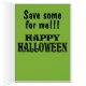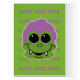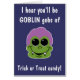 Adorable smiling goblin has green skin, funky purple hair, fangs and big sweety eyes. Front cover: Goblin face with text: I hear you'll be GOBLIN gobs of Trick or Treat candy. Inside front cover: goblin face over nom nom nom patterned background. Inside message: Save some for me!!! Happy Halloween! This is a fun card for your favourite Halloween haunters!