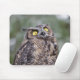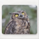 A mousepad featuring a wide-eyed great horned owl. This young owl was turning its head to watch a song bird. It resulted it a rather humourous wide-eyed expression.