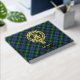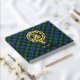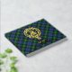 Clan Gordon crest badge surrounded by a strap and buckle over tartan background. Custom front, back and spine text.