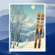 Hello from the snowy mountains of Gore Mountain, New York, Adirondack mountains! We hope you're having a wonderful ski vacation. This postcard features a gorgeous blue-grey mountain landscape with retro ski boards in an orange tribal pattern.