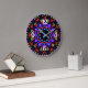 A colourful kaleidoscope or mandala pattern with twelve rays, points or gateways. A true mandala in history has four gates. The pattern has strong blue and purple tones, with fire colours red and orange, and accents of aquamarine, yellow, pink and green. There are four large white numbers with black shading on this clock. The twelve point kaleidoscope is an intriguing design. The number twelve has connections with sacred energy in many religions. In spirituality, twelve can represent balance, completion, dieties and assistance from angels or divine personages. The round shape or wheel is associated with progress, cycles of life, turning of the seasons, wholeness, infinity. Blue can represent honesty, integrity, magic of the night, Yin energy, element Water, truth in dreams, depth of soul. Purple is a royal colour and can mean independence, confidence, wealth and success. Reds and oranges are generally associated with fire and the Sun, warm personality, positive forward motion, passion and goal achievement. Yellow is a colour of optimism and happiness. I hope you enjoy this beautiful work. Original design by M Sylvia Chaume, Canada. Happy blessings!