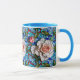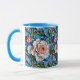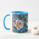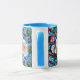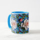 Gorgeous coffee cup with a striking blue and pink faux mosaic floral pattern, featuring vibrant blue, pink and red tiles, with coral-coloured roses intertwined with green foliage. The intricate design mimics the look of a stained glass and ceramic tiles mosaic design, creating an elegant and timeless aesthetic.