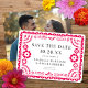 This beautiful papel picado inspired wedding save the date design features a hot pink ornate frame, dark grey text, white background, and modern typography. This elegant yet modern design is a fabulous choice for a Latinx wedding or Mexico destination wedding. On the back is your own "full-bleed" horizontal photo, which can be removed if desired.