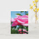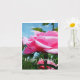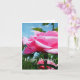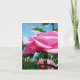 Gorgeous pink rose flower and green leaves in blue card