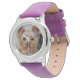 The watch looks exactly as depicted. I was especially pleased with the watch band, which is a nice quality, supple leather. I point this out because an option, which was sold out, was with a multi-colored but clearly plastic band. This is the better choice, in my view.