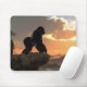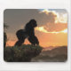 A silverback gorilla stands on a rocky, vegetation covered ledge overlooking a jungle basin. The great ape watches as the sunset breaks through the clouds seemingly lighting the sky on fire. Meanwhile, the evening mists are already rising among the tropical forest in the valley below.