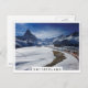 Postcard of the famous red Gornergrat railway train through the snow up the Alps mountains with a view on majestic Mt. matterhorn mountain high above ski resort Zermatt in the Swiss winter in canton Valais, Switzerland with a white edge and in a white box the text 'Switzerland'.