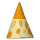 This paper party hat features a fun design based on circular lines, artistic spots and flat polka dots in dark orange on a yellowish white background. The upper part is the same colour as the print.