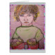 a young boy playing toy bongos from a coloured pencil sketch. also "got bongos?" slogan