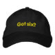 A black hat with gold embroidered Got six?. There is a matching jacket in the Sports product line in Ladiebugs' store.