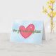 Gotcha Day greeting card marks the anniversary of a child's adoption. It features  a graphic illustrated pink heart on a blue background with clouds and fun lime green typeface on the sentiment " saw ya loved ya gotcha!"