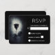 A dark and mysterious wedding RSVP card with a cool illustration of a goth /emo style black rose with red dripping blood on its petals. A black grunge background with an off-white colour in the centre highlighting this moody and macabre rose.