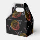Embrace the elegance of black, Crimson and purple autumn roses, as we relish the beauty of the macabre and the allure of the unknown. This enchanting wedding favour box is a dark floral pattern of crimson antique roses, purples and burnt oranges on black. The front has the couples names and wedding date embellished with ornate black gothic flourishes. This favour box is darkly lovely and an enchanting favour from your unique wedding.