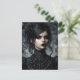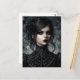 Postcard features oil painting artwork of a goth young woman in black Victorian era fashion. She is striking, with an intense gaze directed at viewer. Her look could also be seen as witchy or vampiric. Abstract textured background in various shades of grey and other neutral colours.