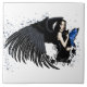 A gothic angel all in black is holding a black cat with blue fairy wings. the two of them are in a white backdrop with blue paint spatter. Black tribal flowers bordering the bottom of them
