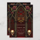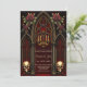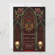 Gothic Archway with Skulls. Set against a mysterious, deep red background, a large Gothic archway rises majestically, decorated with ornate details. The two tall pillars, adorned with delicate carvings, lend the image a poignant elegance. In the middle of the archway shines an impressive stained glass window, the central motif of which is a spider a symbol of patience and creativity. Flanked by two golden skulls, reminiscent of both transience and eternal love, the archway captivates the viewer and promises a celebration full of mystery and fascination.
