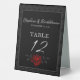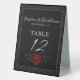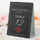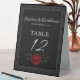 For your Gothic wedding the perfect table numbers. It is designed to be elegant and mysterious. The Design features grey and black damask and a red, bloody rose. The font is in a delicate, almost white shade of grey that contrasts with the dark background. At the bottom there is a bleeding red rose, giving a mysterious and slightly dark touch. The rose symbolises love and passion while the blood represents the depth of emotions. Overall, it exudes a certain drama and intensity that immediately attracts the attention of everyone. It's perfect for couples looking for an unconventional and unique wedding.