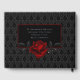 The Design features grey and black damask and a red, bloody rose. The font is in silver foil that contrasts with the dark background. At the bottom there is a bleeding red rose giving a mysterious and slightly dark touch. The rose symbolises love and passion while the blood represents the depth of emotions. It's perfect for couples looking for an unconventional and unique wedding. Easy to personalise with photos and text.