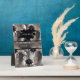A classic watercolour style pattern of black amaryllis flowers provide the background to this napkin design . Moody tones of black and gray, and a grunge style font add to the dark ethereal theme of this alternative wedding suite.