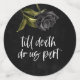 Gothic halloween theme bridal shower party decor confetti featuring illustration of black rose with text that says "till death do us part."