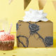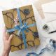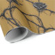 Goth style wrapping paper features AI generated speedpaint style pattern of black roses and vines on a golden brown background.