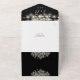 All in one gothic wedding invitation featuring black and white roses florals and string lights falling across elegant typography. The invitation includes a perforated RSVP card that features your wedding website QR code and details. Designed by Thisisnotme©