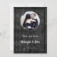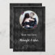 Darkly beautiful save the date card with gold circle and dark purplish roses on a black diamond pattern background. Script typography for the names. Personalize with your own photo and wedding date and place.