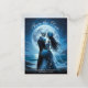 This elegant gothic wedding save the date announcement postcard features a skeleton couple wearing blue wedding attire in a romantic setting with the moon and ocean behind . The back of the postcard has the image of the faded skeleton couple and your wedding details. Imagegenerated with AI.