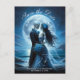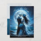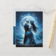 This elegant gothic wedding save the date announcement postcard features a skeleton couple wearing blue wedding attire in a romantic setting with the moon and ocean behind . The back of the postcard has a matching image and your wedding details. Image generated with AI.