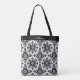 A black and white vintage-looking damask pattern covers this elegant tote bag that has a distinctive Goth look.