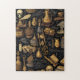Vintage look dark academia puzzle features skulls, books, bottles, and apothecary ingredients on a black background.