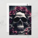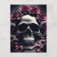 A dark and gothic painting of a human skull surrounded by pale gothic roses and petals, featuring a creepy desaturated gothic atmosphere and otherworldly atmosphere, this postcard is perfect for lovers of dark gothic skulls and dark romantic gothic flowers and roses.