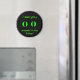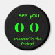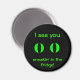 This is a round black fridge magnet with neon green eyes on it and the words "I see you, sneaking in the fridge!" Cute goth fun that blends well with Halloween. Gotta keep control with all those yummy dark treats in there.