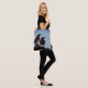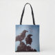 Tote bag with black ravens peering off together with a blue background. The image is distressed and overall has a "Gothic" look.