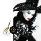 Her face is painted a porcelain white, with meticulously crafted makeup that accentuates her features. Bold, red lips stand out against her pale skin, drawing the viewer’s attention and adding a dramatic flair to the composition. Her eyebrows are shaped into an artistic and unconventional form, resembling delicate feathers, which enhances the overall mystique of her appearance.