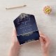 All in one gothic wedding invitation featuring black and gold roses florals falling across elegant typography on a midnight blue background. The invitation includes a perforated RSVP card that features your wedding website QR code and details. Designed by Thisisnotme©